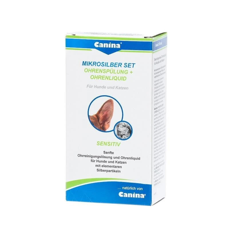 Die Canina Pharma Mikrosilber Ohrenpflege für Hunde und Katzen besteht aus Ohrenspülung, die sanft die Ohren reinigt, ohne die Ohrenschleimhaut zu reizen und einem beruhigendem Ohrenliquid für die besondere Pflege der Ohrenschleimhaut.