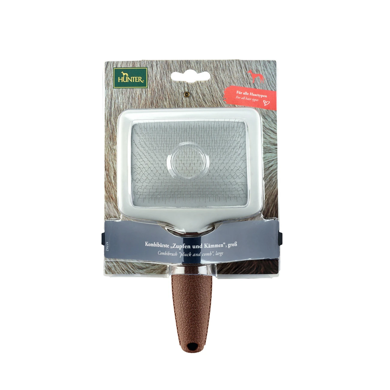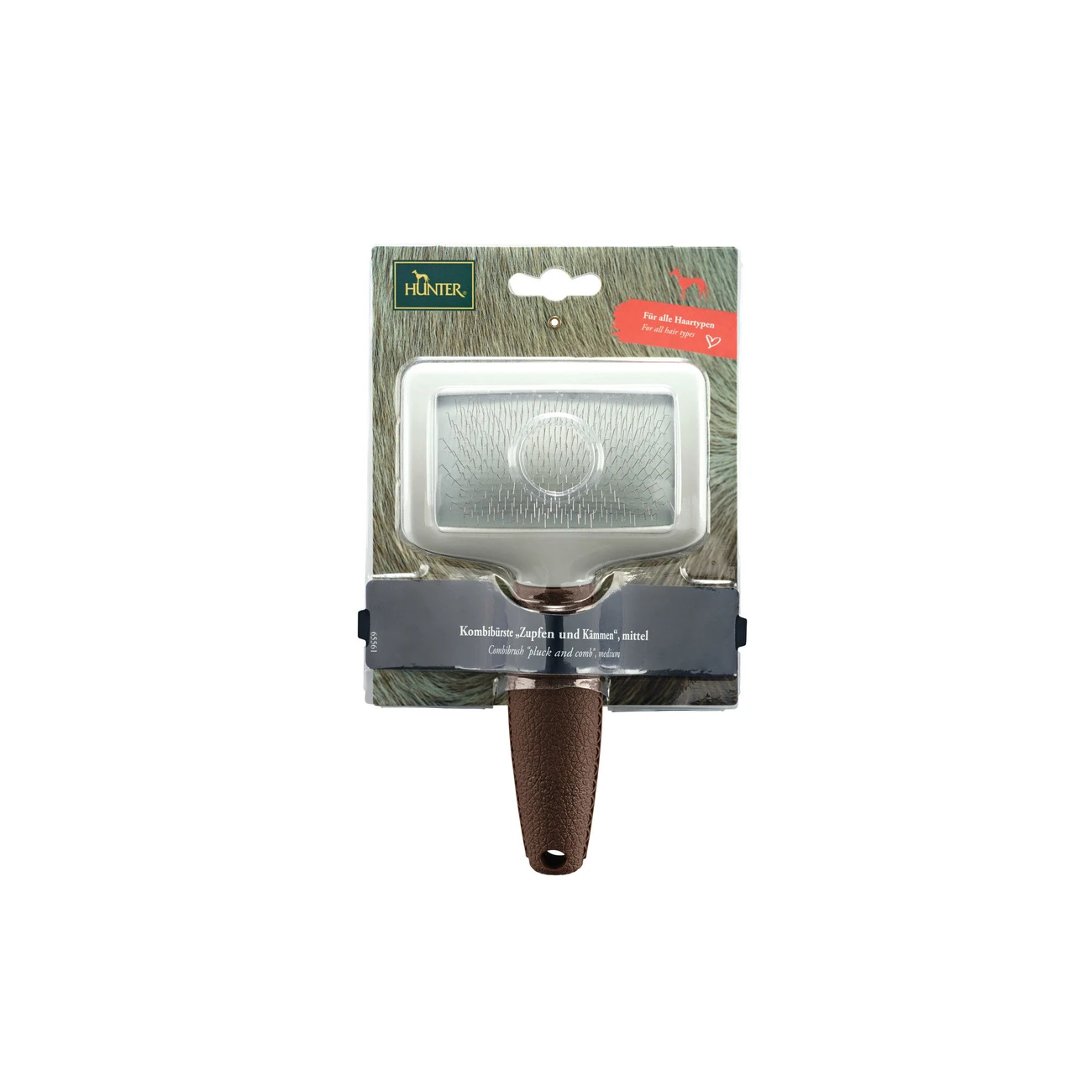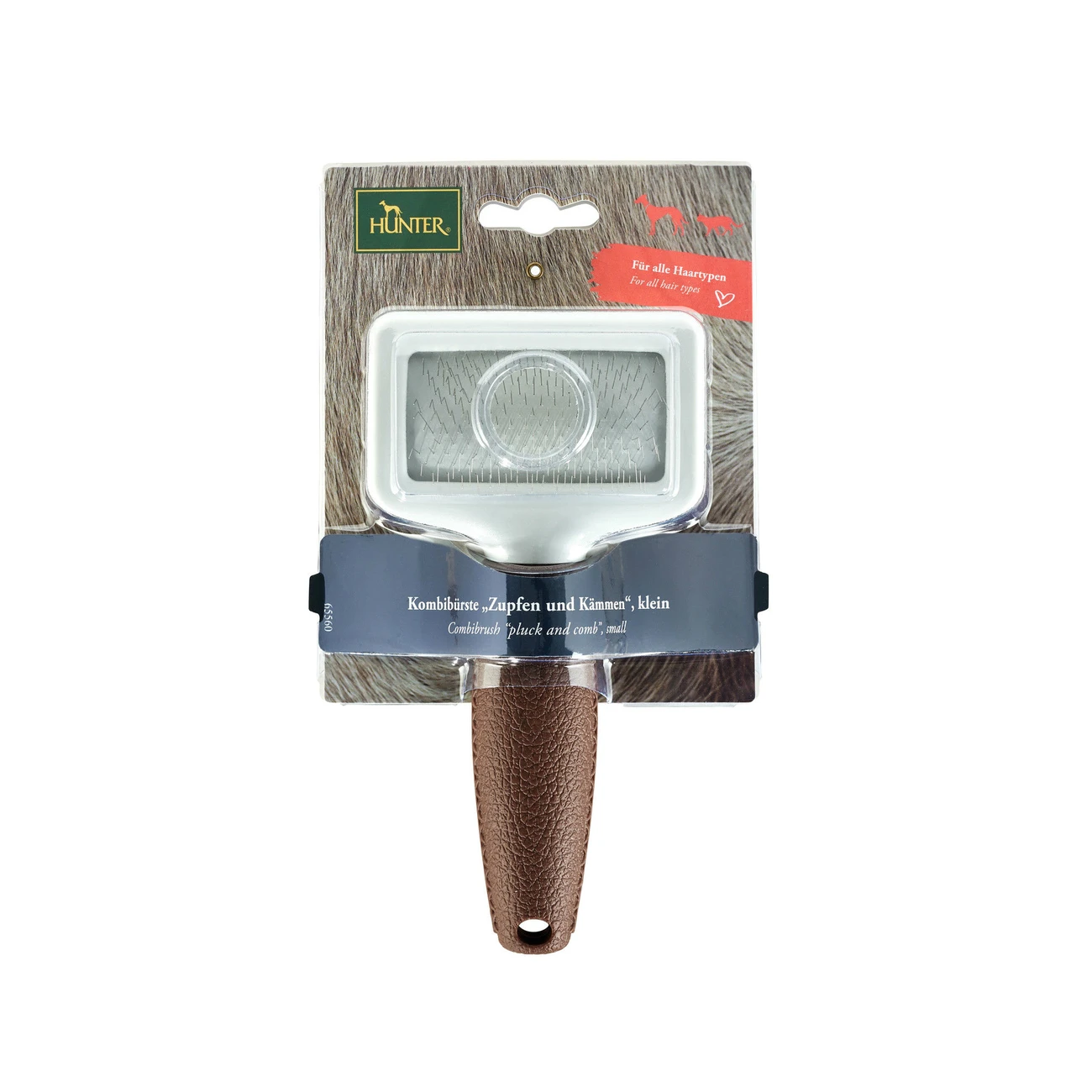 Die HUNTER Kombi-Bürste aus der Serie SPA ist die perfekte Kombi-Lösung für die ultimative Katzen- und Hundepflege: Durch die rotierenden Zinken gleitet der Kamm besonders sanft durch das Fell. Dabei löst er schonend und leicht auch hartnäckige Verknotungen. Dann die Bürste einfach drehen und schon ermöglicht die Zupfbürste mit extraweichen Edelstahlpins das Entfernen von toter Deck- und Unterwolle und sichert so perfekte Hygiene. Der ergonomisch geformte Handgriff in wertiger Lederoptik sorgt dabei für eine rutschfeste und komfortable Bedienung bei der Pflege. Die Bürste ist in drei Größen erhältlich und eignet sich für kurz-, mittel- und langhaarige Hunde (in der kleinsten Größe auch für Katzen).