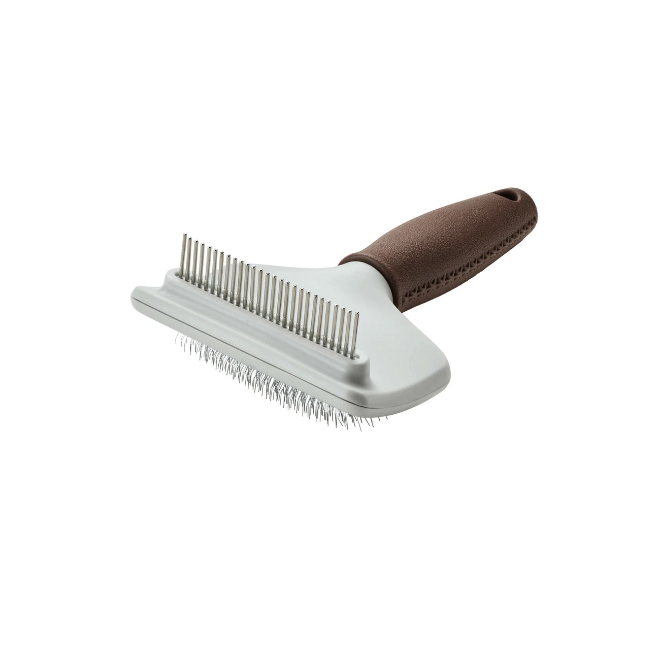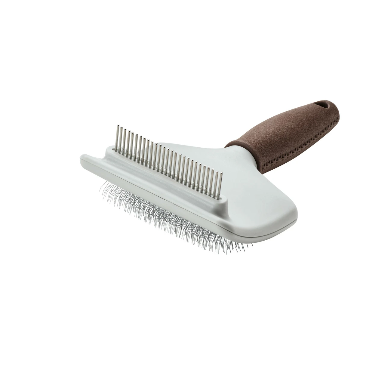 - Metallkamm mit rotierenden Zinken auf der einen, Bürste mit extraweichen Edelstahlpins auf der anderen Seite