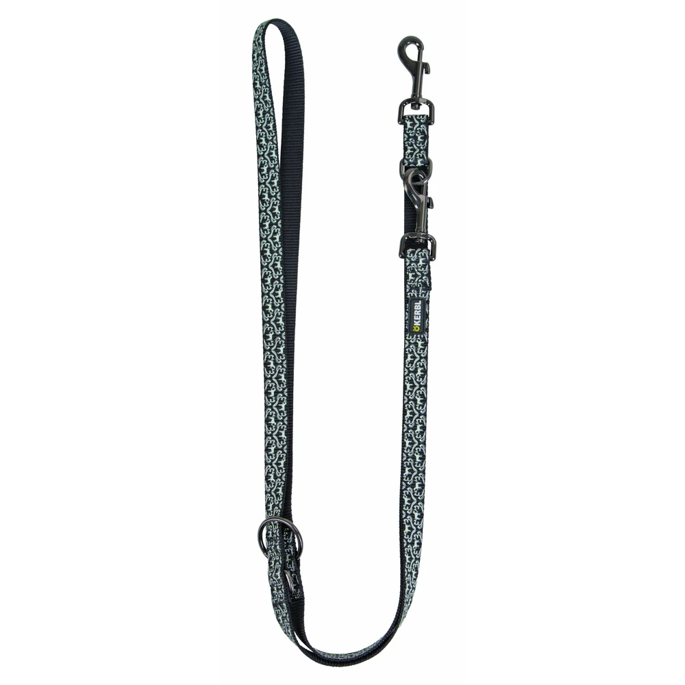 Fluoreszierende Hundeleine Shiny Night von Kerbl, mit nachleuchtendem Aufdruck – speichert das Licht und leuchtet im Dunkeln.