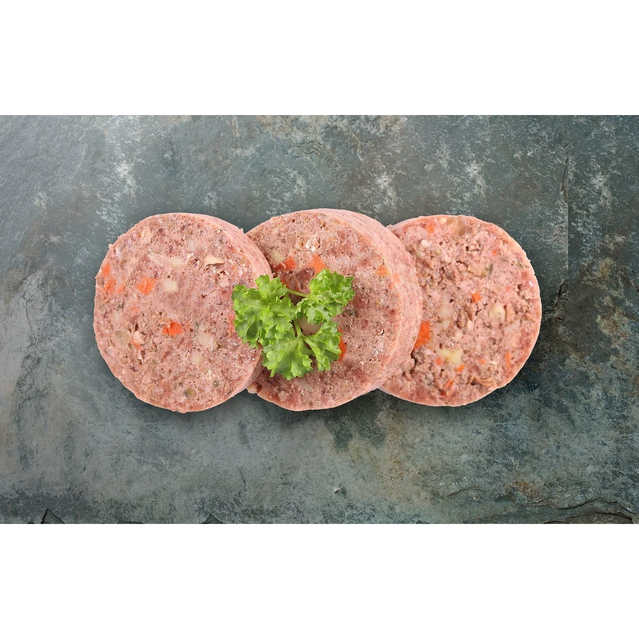 Frisches Rindfleisch, Muskelfleisch 38%, Herz 14%, Leber 9% vom Weiderind | Kartoffeln 10,5%, Zucchini 9%, Karotten 8,5%, Äpfel 8,5% | Rapsöl 0,7%, Eierschalenpulver 0,5% | Mineralerde, Seealge, Leinsamen, Hagebutten, Brennessel, Rucola 1,2% | Rosmarin, Peter- silie, Liebstöckel 0,1% | Calcium/Phosphor-Verhältnis 1,3 : 1,0