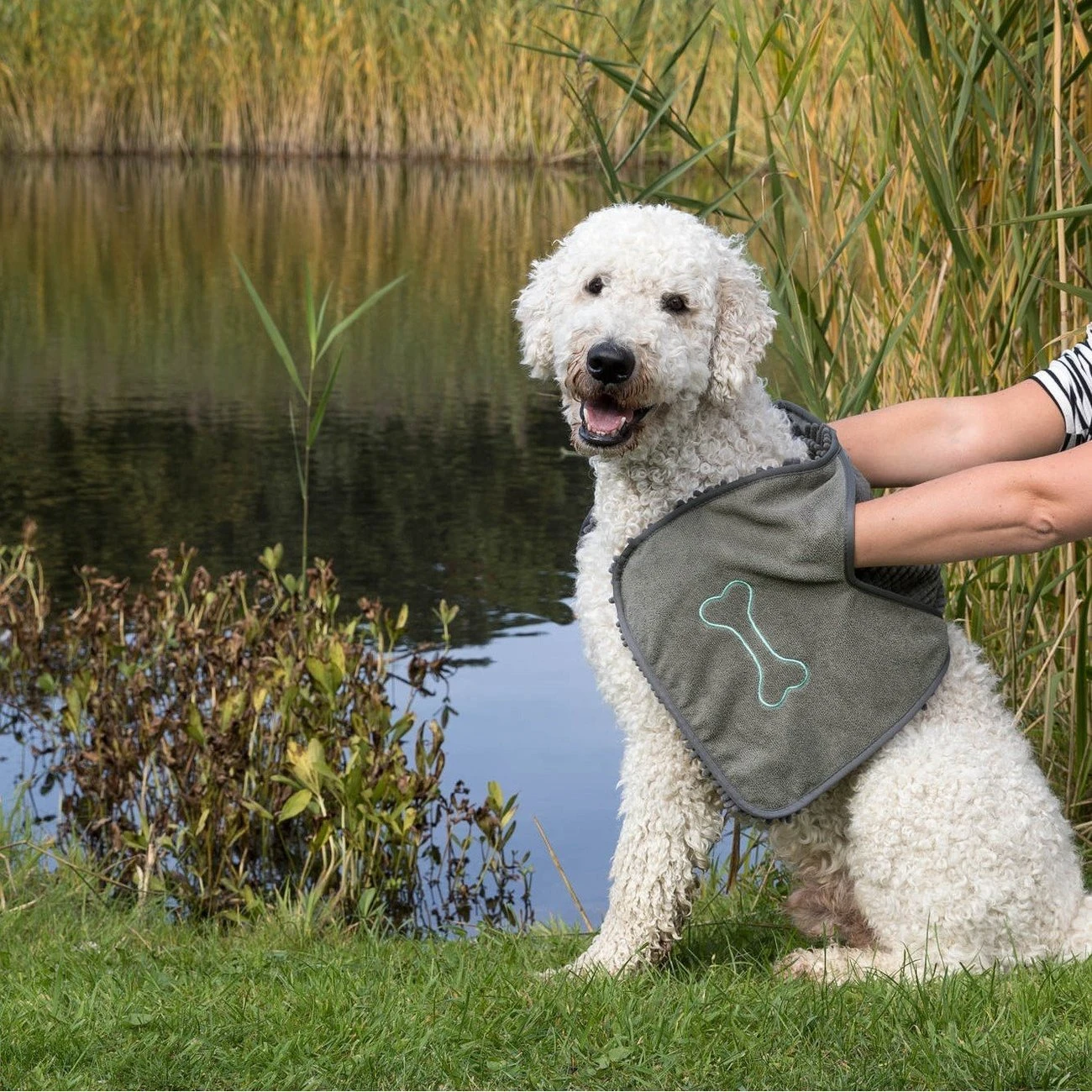 Nach dem Duschen oder einem Badeausflug ist das Handtuch mit Laschen von Trixie besonders nützlich.